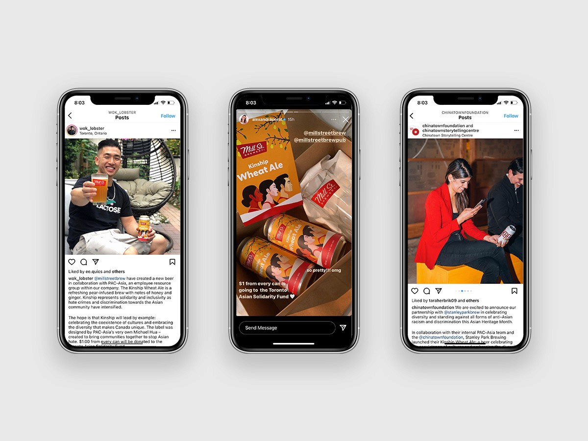 THE CHALLENGE: Following a rise in discrimination and hate crimes against the Asian community after COVID-19, Mill St. Brewery and Stanley Park set out to design packaging for new “Kinship” products that conveys solidarity and celebrates inclusivity across these communities. THE SOLUTION: In collaboration with Pac Asia, we created two packaging designs that blend the brand’s existing colour palette with Asian-inspired iconography and prominently feature groups of people from different Asian communities united in solidarity.